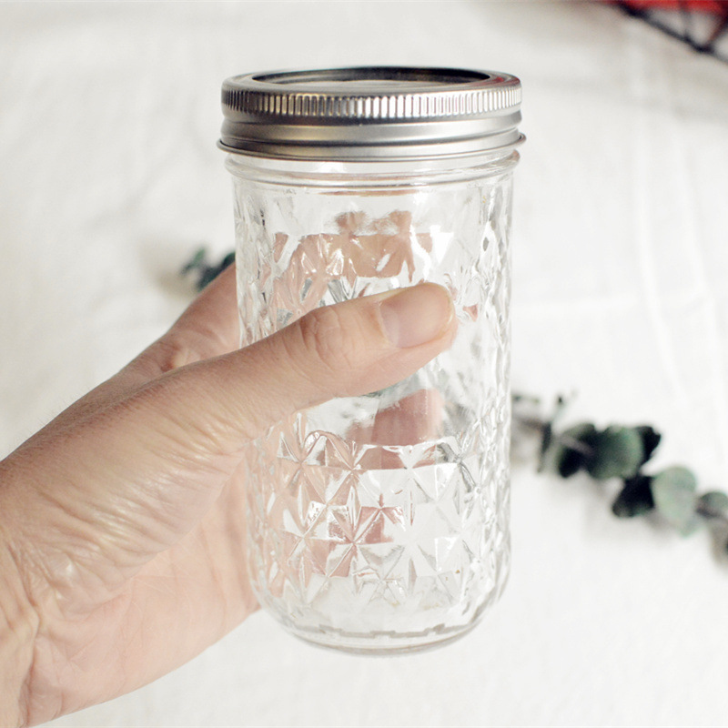 Couvercle en fer blanc bocal en verre Diamant Diamant Bouteille de caviar Bouteille de miel Bouteille de thé au lait Bouteille à gâteau Ces bouteilles en verre transparent peuvent résister à des températures élevées et basses, ce qui les rend utilisables pour le remplissage à chaud ou le pressage à froid de boissons végétales et de jus.