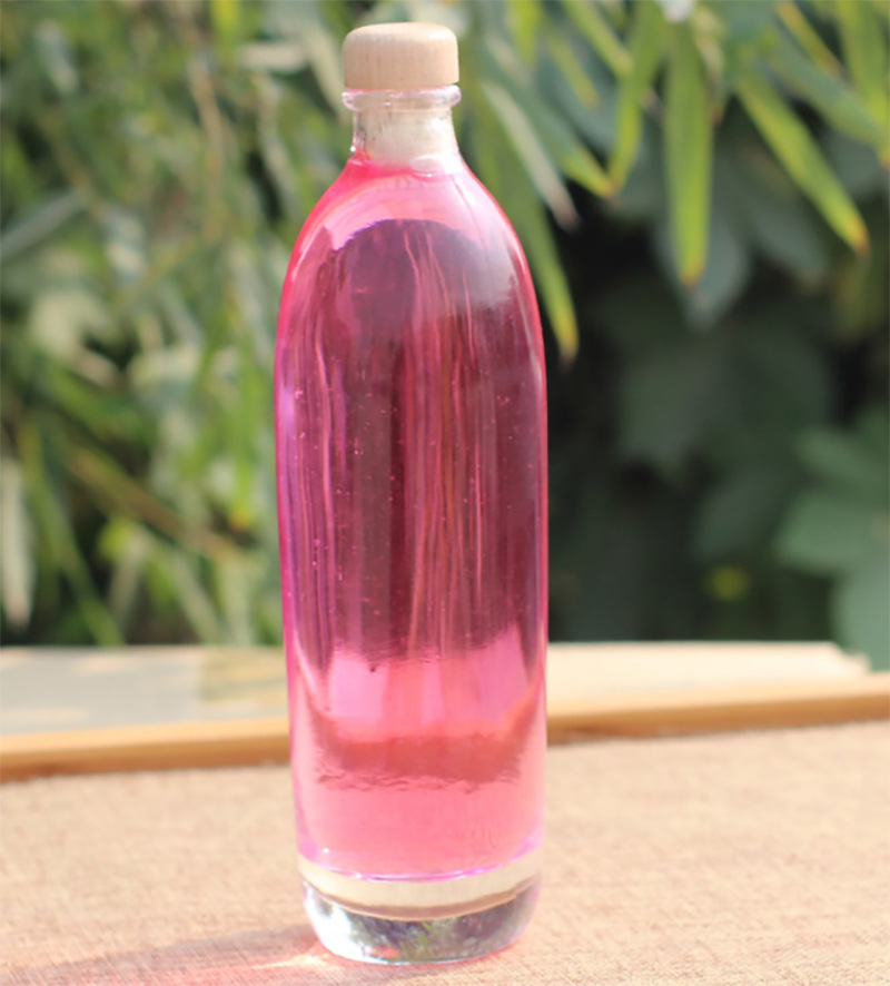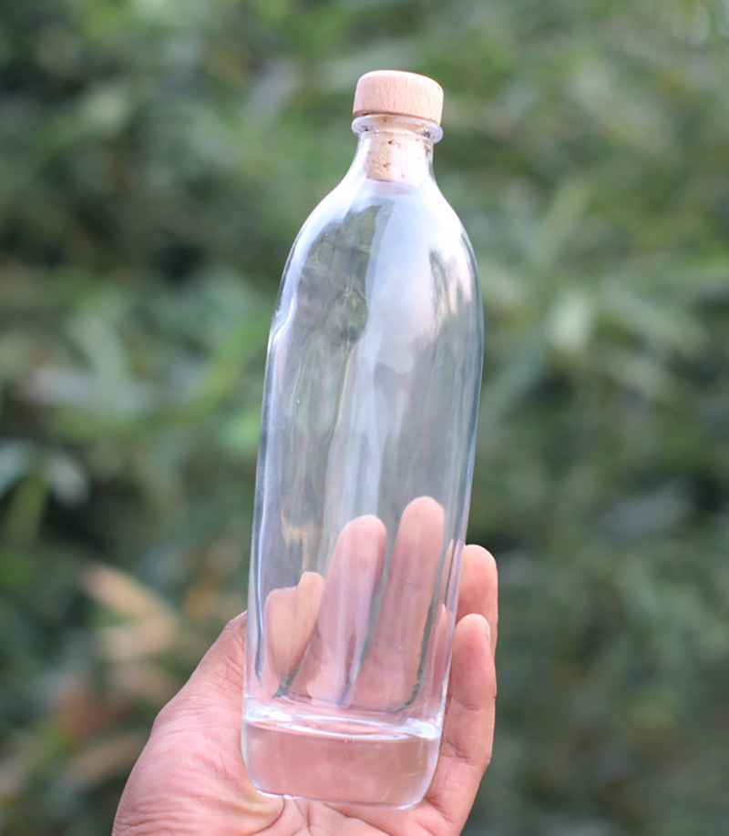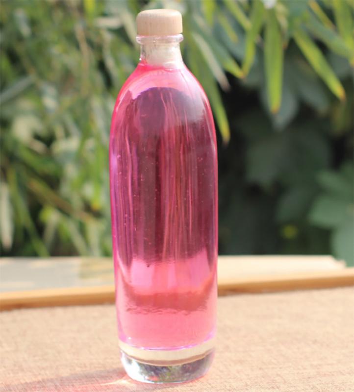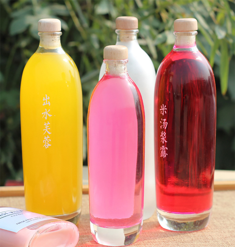 Bouteille en verre de vin de fruits transparents, bouteille de boisson, bouteille de vin vide, bouteille de vin de litchi cerise rose pêche.